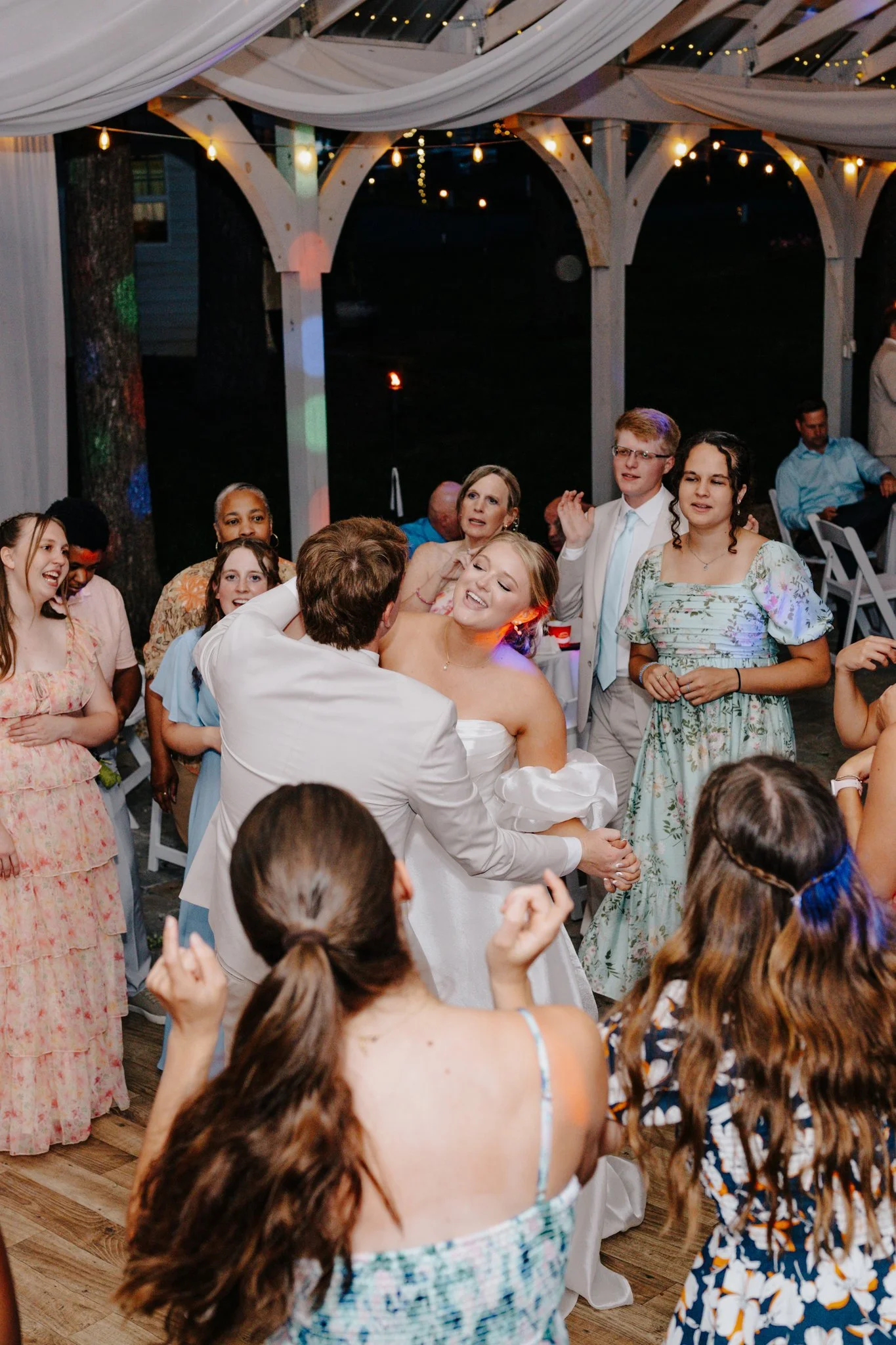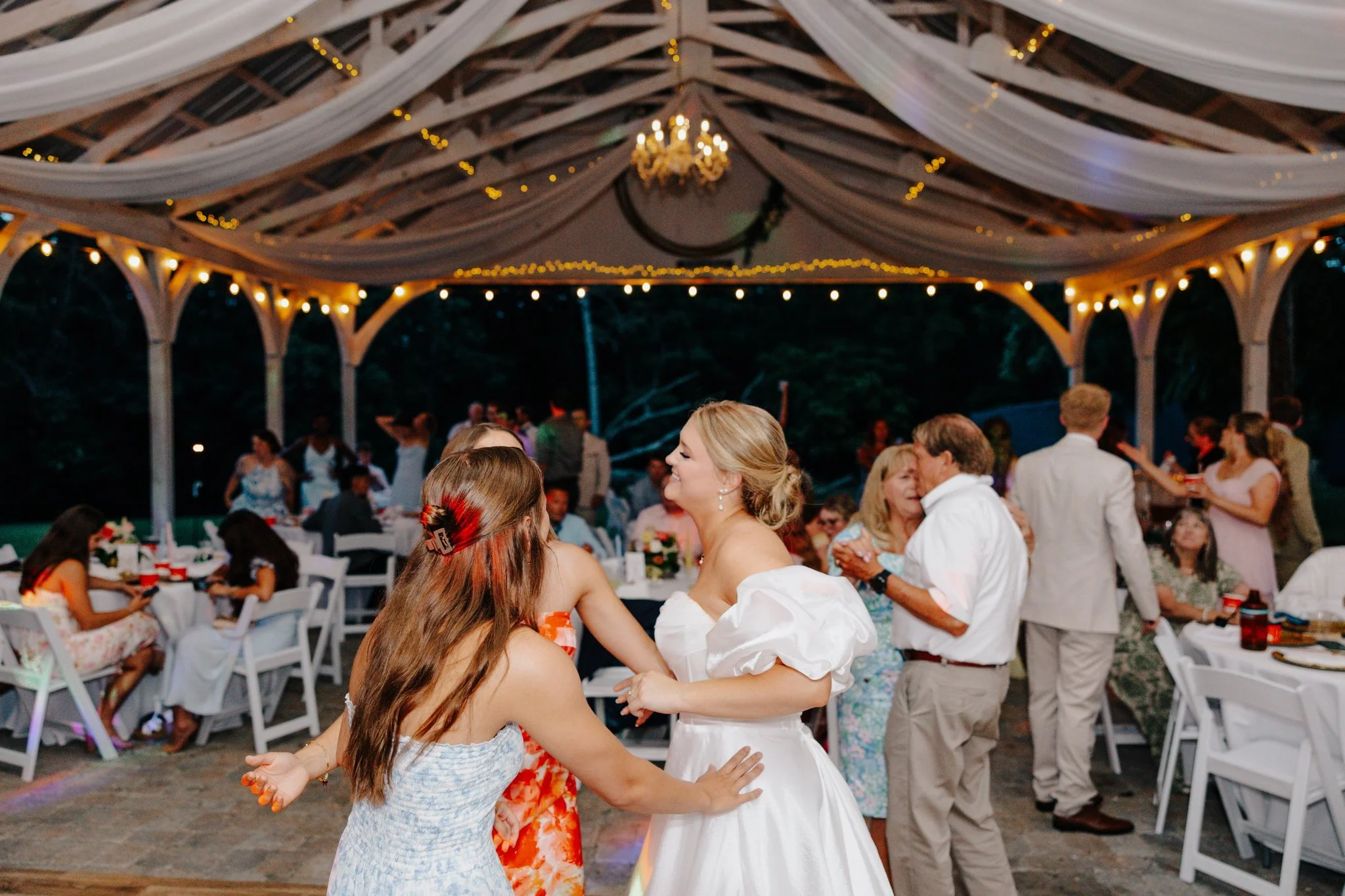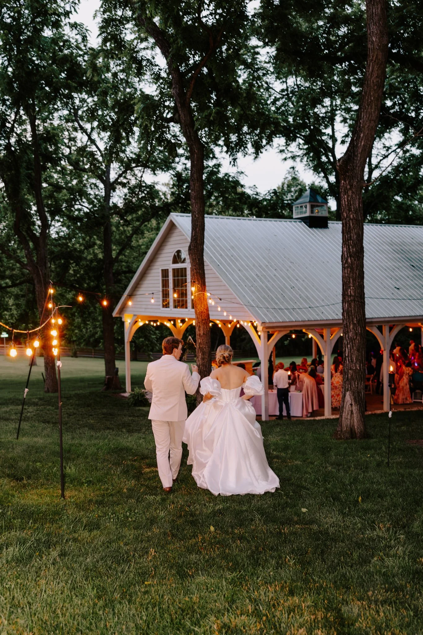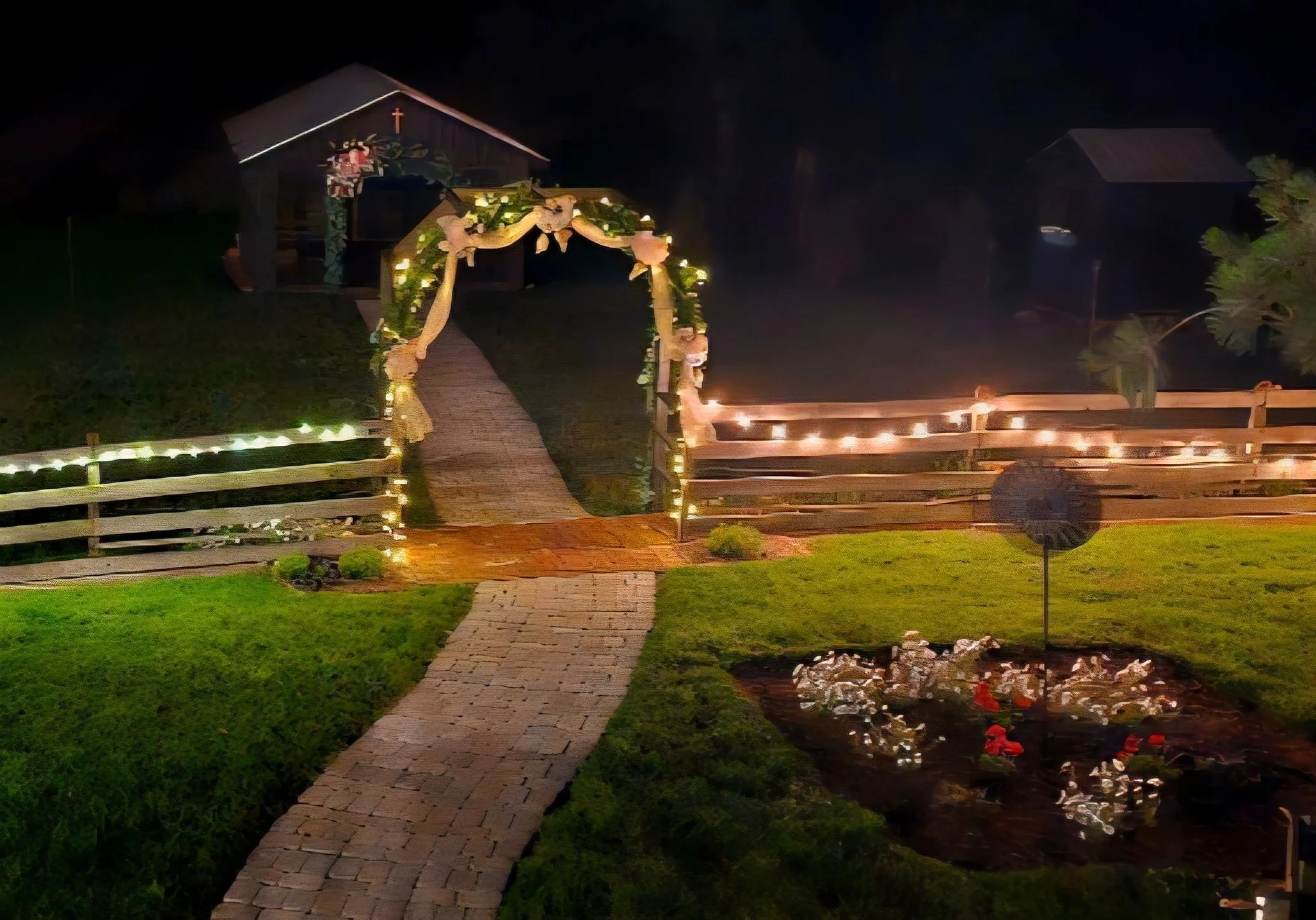 Our reception pavilion is nestled under towering walnut trees providing cool shade in summer and gentle breezes. The pavilion is a massive 32’x80’ structure (2,560 square feet) with 10 foot sides and a 22 foot ceiling. The floor is a charming old world style gray stone. Lighting includes cafe style bulb perimeter lighting, twinkling strands throughout the ceiling and three crystal chandeliers on dimmer switches so you can set your mood.